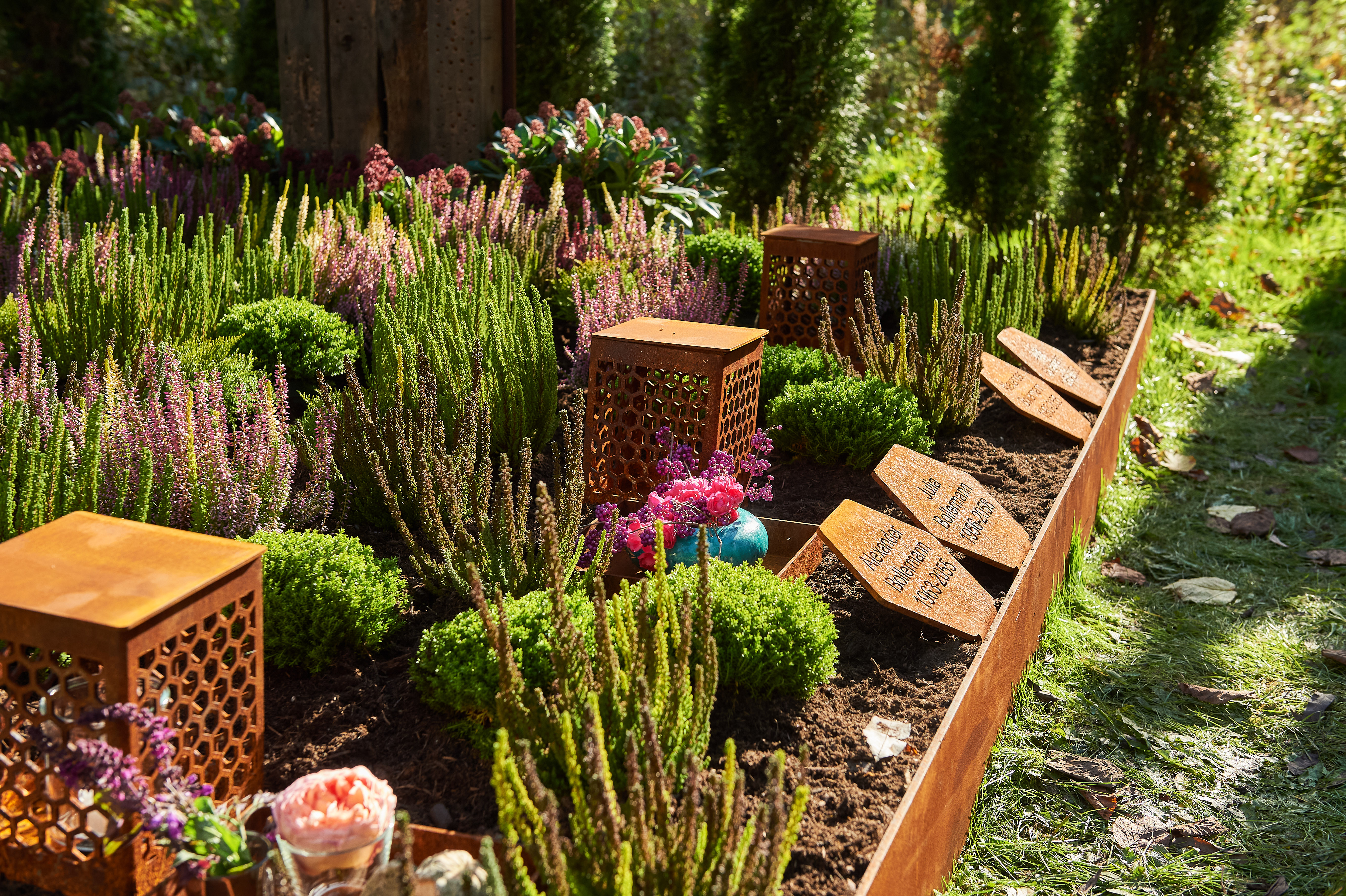 Im Unterschied zu vielen pflegefreien Grabstellen steht den Angehörigen hier ein fester Anlaufpunkt zur Verfügung, den sie jederzeit besuchen können.